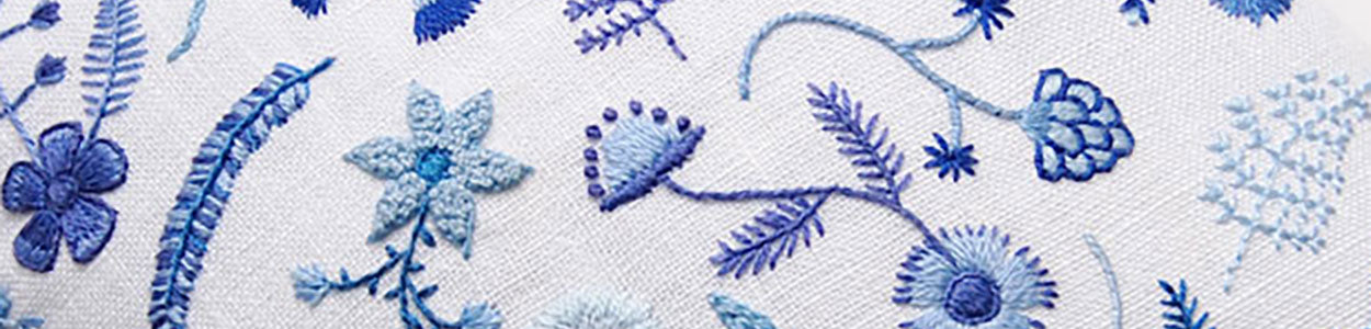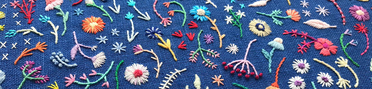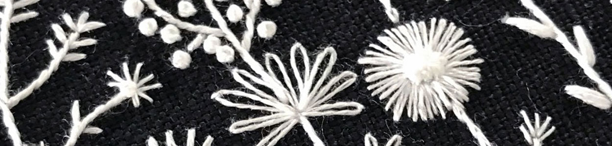 Monochromatic hand embroidery is equal parts challenging and enjoyable. As someone who tends to use a variety of color in most designs, I find that using only one color of thread makes me plan out my particular motifs with more careful consideration.